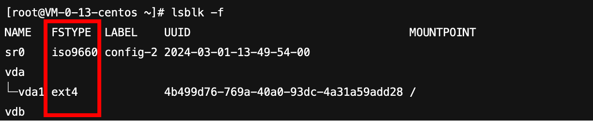 lsblk 커맨드의 결과를 보면, 현재 루트 리소스는 /dev/vda 이고, /dev/vda1 를 파티션으로 가지고 있습니다. 방금 연결한 /dev/vdb는 파티션이 없습니다. 스냅샷에서 가져온 볼륨이 아닌 이상 파일시스템이 설치되있을리 없지만 한 번 확인해봅니다.