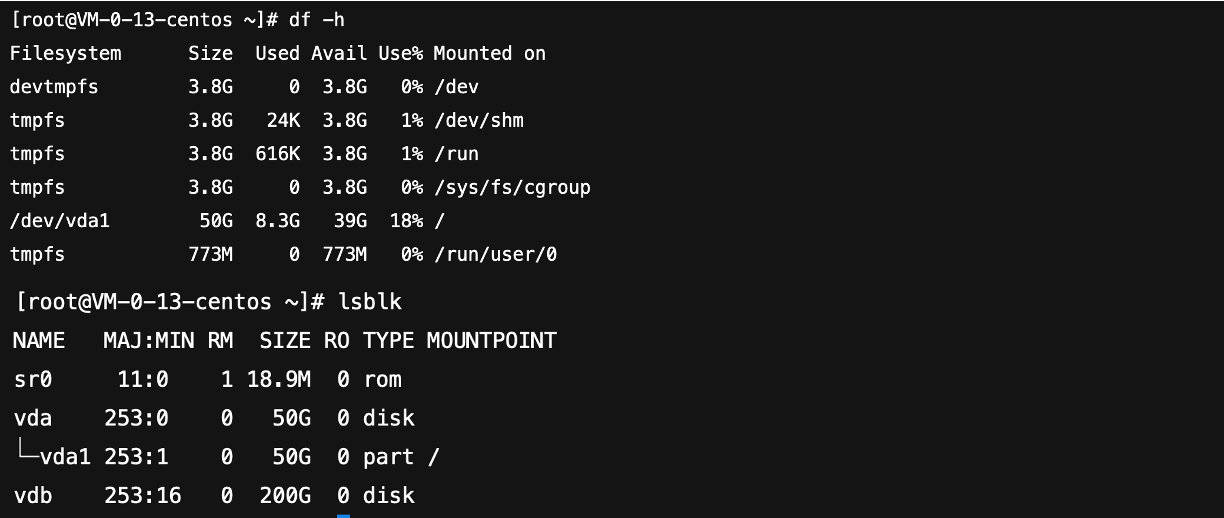 새로 추가된 200GB짜리 데이터 디스크가 lsblk 명령어 결과에는 보이지만 df -h 명령어 결과에는 보이지 않는 이유는 디스크가 시스템에는 인식되었지만, 아직 파일 시스템이 생성되지 않았거나 마운트되지 않았기 때문입니다.