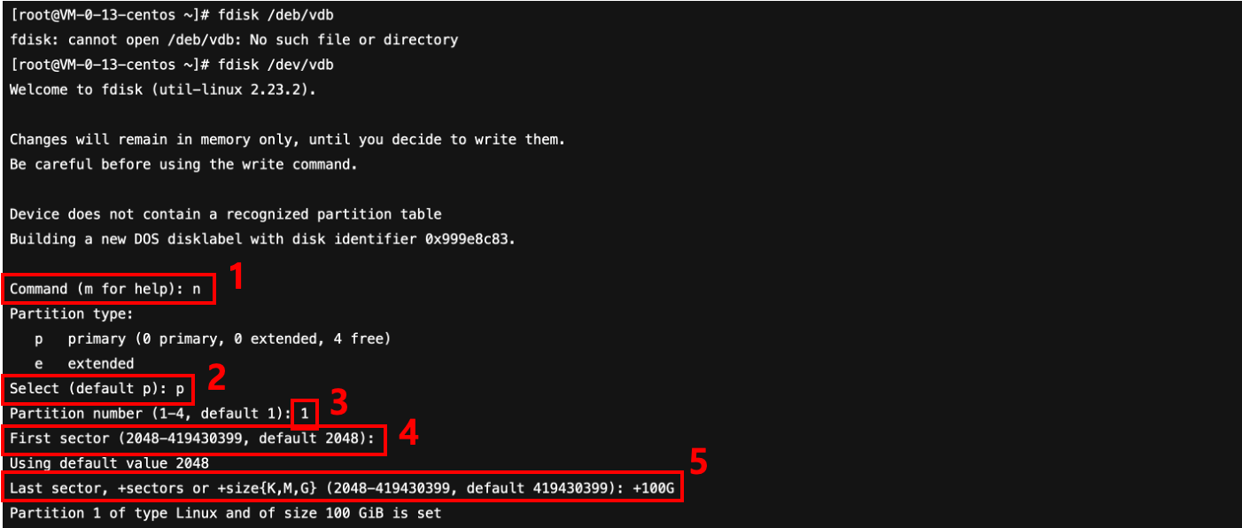 디스크의 용량이 2TB 미만인 경우 일반적으로 MBR(Master Boot Record)을 사용하고, 2TB 이상인 경우에는 GPT(GUID Partition Table) 파티셔닝 메커니즘을 사용합니다. 파티셔닝이 필요하지 않은 경우, 곧바로 연결된 볼륨에 파일시스템을 설치합니다. 이 글에서는 디스크를 100GB, 50GB 두 개의 데이터 파티션과 남은 공간을 모두 스왑 파티션으로 하는 총 3개의 파티션 구성을 진행합니다. Tencent Cloud 공식문서에 EXT4를 예시로 유사한 과정을 소개하고 있으므로 XFS를 기준으로 소개합니다.