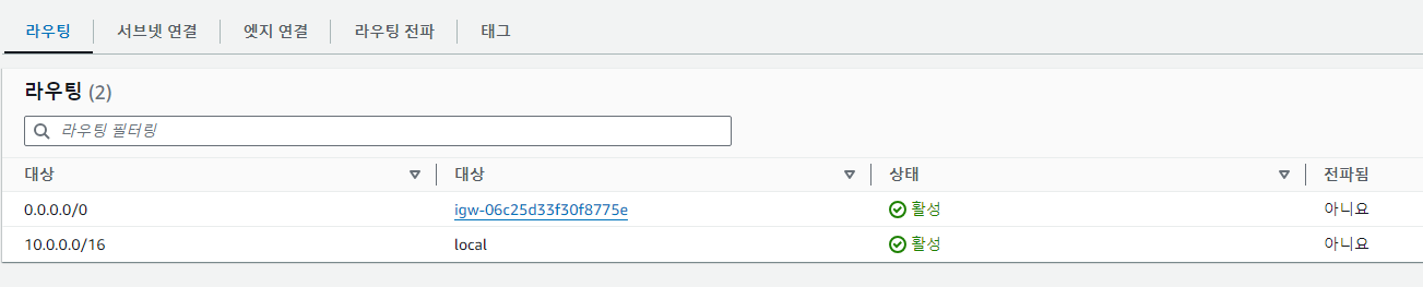 그에따라 동일VPC 로컬 영역을 제외한 모든 트래픽을 Internet gateway로 내보내는 기본 라우팅 테이블이 자동으로 바인딩 된다.