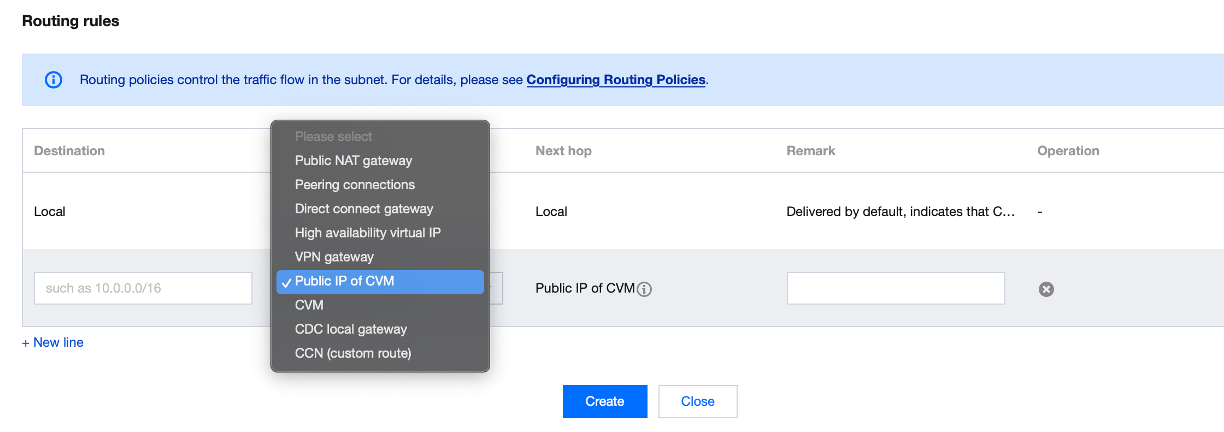 실제로 Tencent cloud 콘솔에서 라우팅 테이블을 생성할때 목적지 중에 인터넷게이트웨이가 없는 것을 확인할 수 있다.
