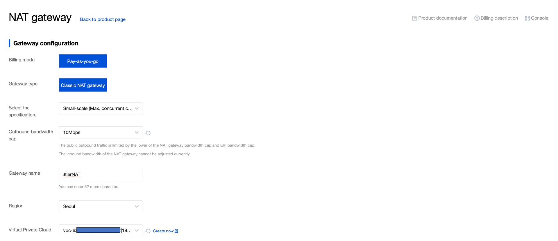Tencent cloud에서는 AWS와 달리 별도의 Internet gateway 설정 없이 EIP(혹은 Public IP) 만으로 외부 퍼블릭 서브넷 리소스의 외부 인터넷 연결이 가능하다. 프라이빗 서브넷의 경우 NAT Gateway를 통해야 하므로 (EIP가 할당된 CVM을 public gateway로 하여 외부 인터넷으로 라우팅 하는 방법도 있긴 하다. 이에 대한 내용은 이후에 다른 글에서 자세히 설명하기로 한다.) 퍼블릭 서브넷에 NAT Gateway를 두고 내부 프라이빗 서브넷의 외부 인터넷 트래픽 요청을 라우팅 한다.