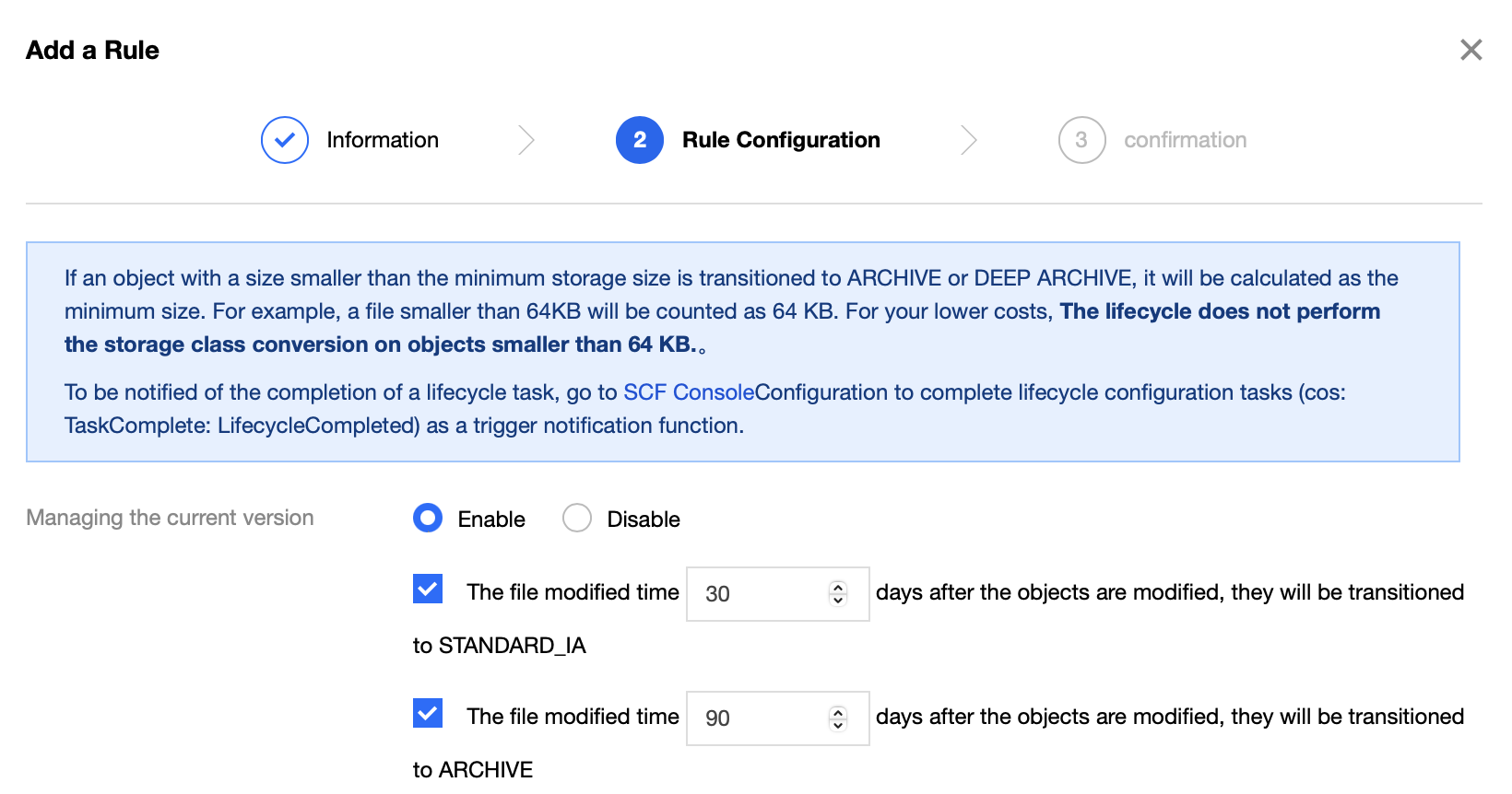 특정 시나리오에서 COS Bucket에 업로드 된 데이터는 시간이 지날 수록 R/W 빈도가 줄어드는 경향이 있다. 이럴때Bucket의 수명주기를 설정하여 특정 시간이 경과한 데이터의 경우 자동으로 삭제하거나 좀 더 콜드한 스토리지 클래스로 이동시키는 방법을 통해 불필요한 스토리지 비용을 절감할 수 있다.