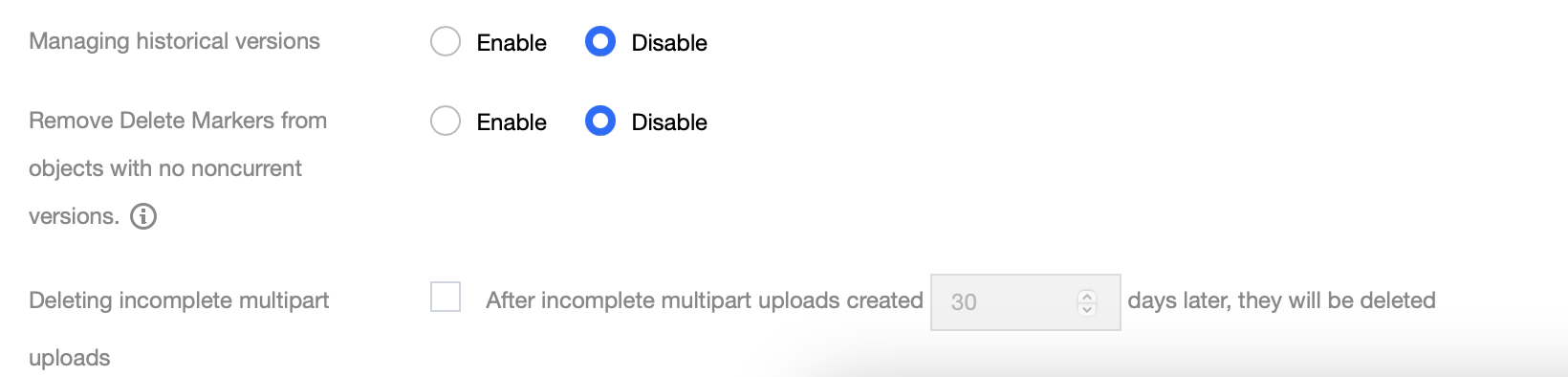 수명주기 옵션 이외에도 여러가지 버전관리 및 히스토리 파일 관리 규칙 설정이 가능하다. 버전관리가 활성화된 경우, 유저가 object를 삭제하면 실제로 object가 삭제되는 것이 아닌 'Delete Marker'라는 특수 객체가 생성된다. 이 'Delete Marker'는 object가 삭제된 것처럼 행동하지만 실제 object는 여전히 버전 형태로 저장된다. 옵션 조정을 통해 데이터의 모든 버전이 삭제되어 최종적으로 남은 버전이 Delete Marker일 경우 이를 자동으로 제거하는 기능을 제공한다.